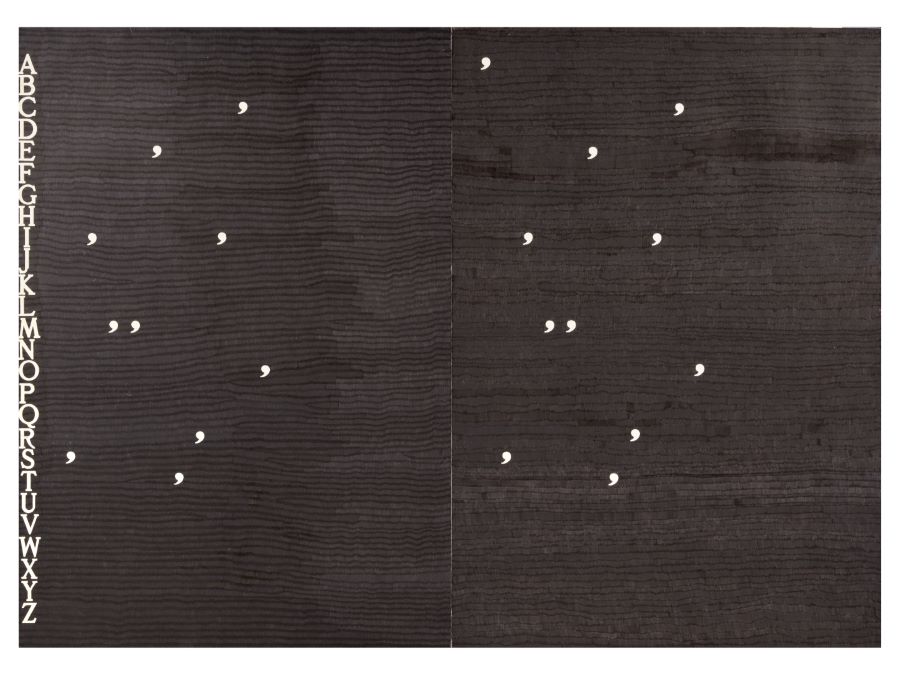 Tecnica: biro nera su carta, due elementi applicati su pannello
