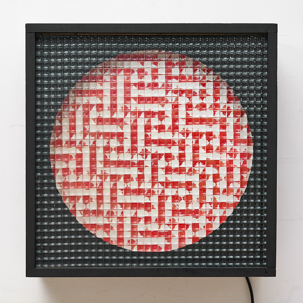 Tecnica: Oggetto cinetico, legno, vetro industriale, motore eletttrico, scacchiera rossa
