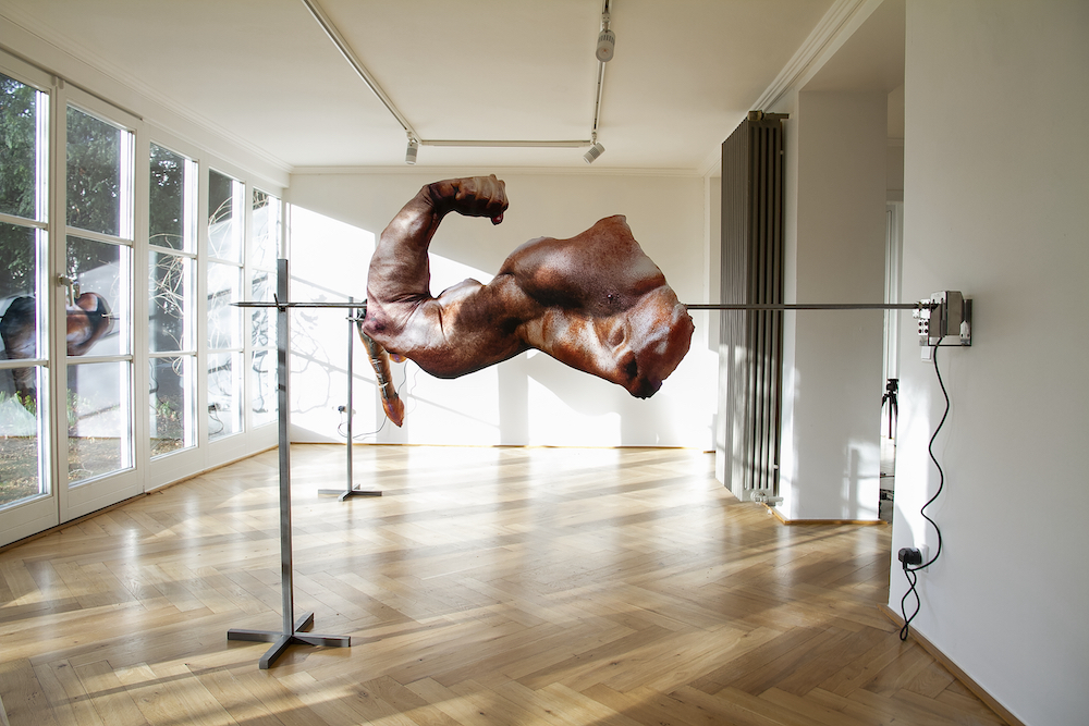 Tecnica: Scan photograph of bodybuilding magazine printed on polyester satin, polyester stuffing, rotary motor, steel structure