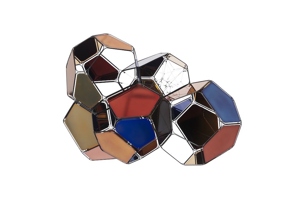 Tecnica: Acciaio inossidabile verniciato a polvere, corda in poliestere, filo da pesca monofilamento, cavo di metallo, pannelli in metallo semitrasparenti verniciati a colore e laccati