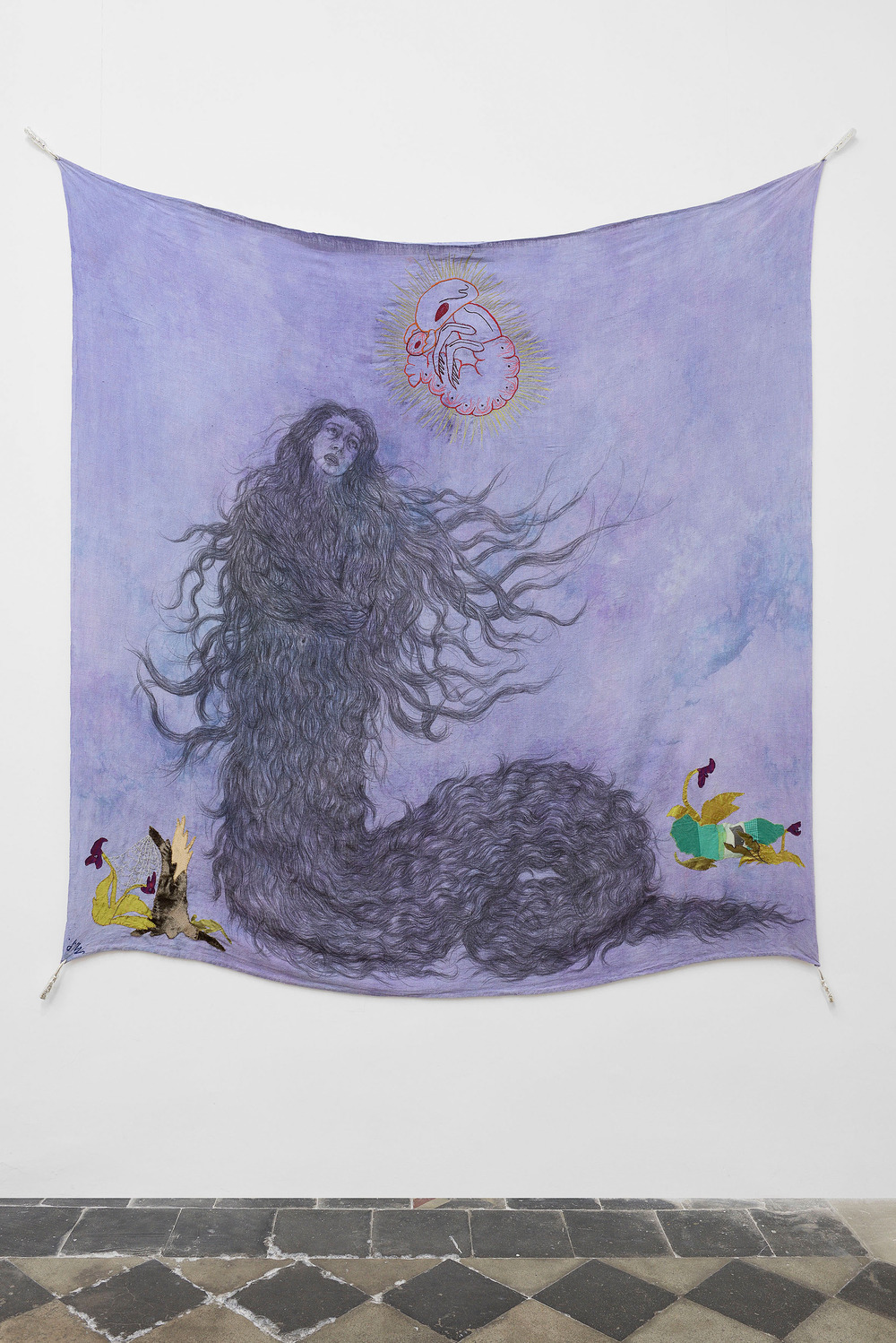 Tecnica: graphite, embroidery, glass beads, hand dyed fabric on dyed linen tablecloth