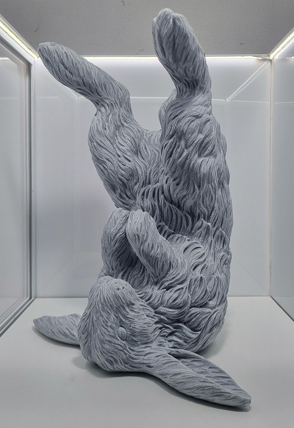 Tecnica: scultura in marmo grigio e teca in ferro plexiglass, impianto luminoso
