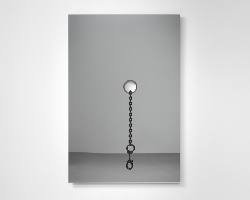 Tecnica: Specchio colorato, acciaio inossidabile, catena in acciaio inossidabile, manette
