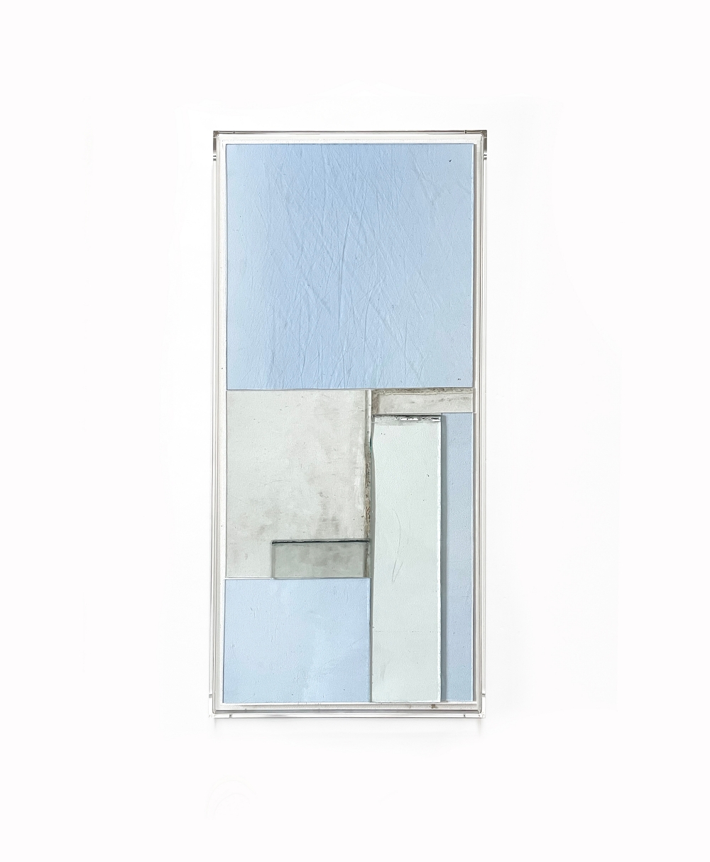 Tecnica: light blue glass, recycled transparent glass, hooks, nails, plexiglas frame